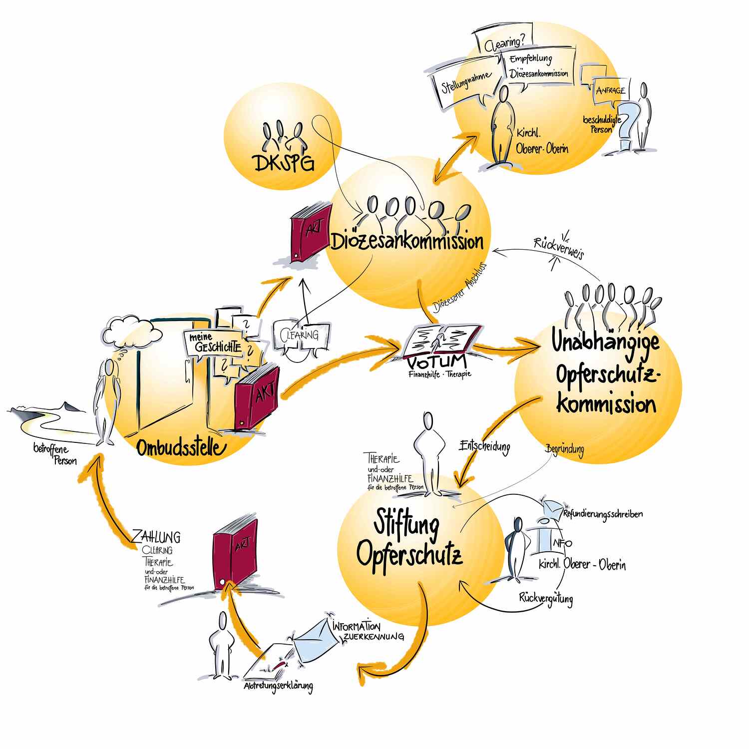 Die Ombudsstelle nimmt Meldungen entgegen und dokumentiert die Angaben. Mit Einverständnis der betroffenen Person werden die Unterlagen an die Diözesane Kommission weitergeleitet, wobei die Ombudsstelle ein Votum hinsichtlich Hilfestellung abgibt. Bei Bedarf leistet die Ombudsstelle der betroffenen Person Unterstützung (z. B. Akuttherapie).